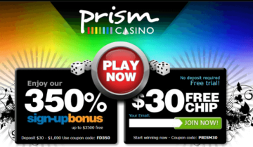 Prism Casino has an exciting welcome bonus of 350% up to $3500 for new players. All you need to do is deposit a minimum of $30 and use the coupon code: FD350 to claim. For punters who would like a free trial instead, the casino is giving away a $30 free chip when using coupon code PRISM30.